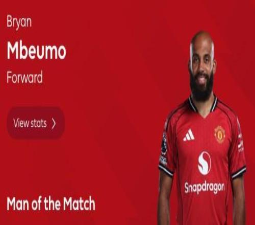 英超第9轮,曼联主场4-2击败布莱顿,此役上演梅开二度的曼联前锋姆伯莫当选英超官方全场最佳球员。